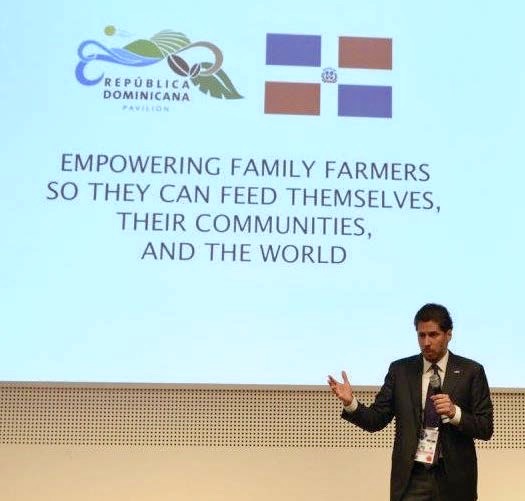 Mario Arvelo realiza una presentación durante el panel internacional de expertos «Empoderar a los agricultores familiares para que pueden alimentarse a sí mismos, a sus comunidades y al mundo», del que fue facilitador. Partiendo del tema de la exposición universal Expo Milano 2015 —que invitó a hacedores de políticas agroalimentarias de todo el mundo a formular propuestas para que la seguridad alimentaria y nutricional de todo el mundo pueda ser garantizada de modo sostenible para 2050— Arvelo organizó el panel alrededor de la convergencia de conocimientos técnicos y de experiencias de buenas prácticas sobre el terreno.