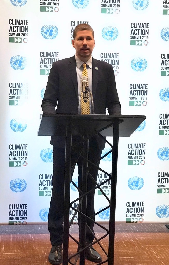 Mario Arvelo ofrece declaraciones durante la Cumbre de Acción Climática convocada por la Organización de Naciones Unidas (ONU), en la que participó atendiendo una invitación especial de la secretaria general adjunta de la ONU Amina Mohammed. La Cumbre fue celebrada en Nueva York del 21 al 23 de septiembre de 2019.