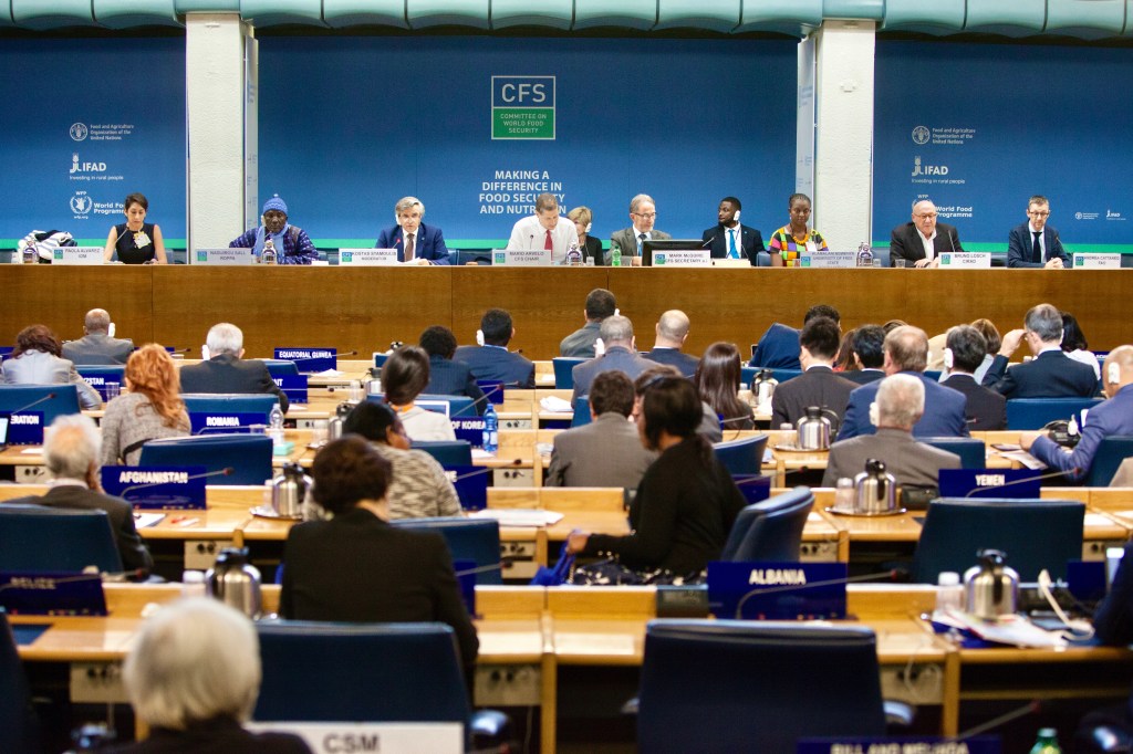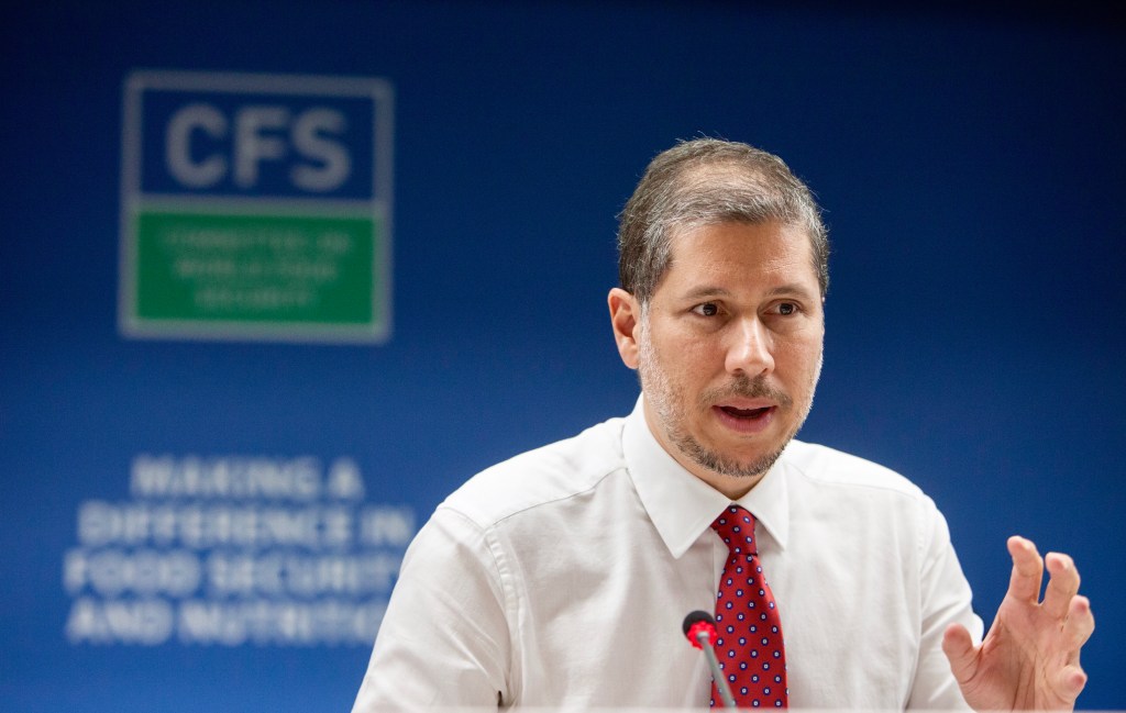 Mario Arvelo preside el panel internacional de expertos que abordó los nexos entre migración, agricultura y desarrollo rural, a partir del informe «El estado mundial de la agricultura y la alimentación», conocido por las siglas SOFA. El debate, en el que participaron ministros de agricultura y desarrollo rural, abordó las múltiples formas que adopta la migración rural y la función que esos flujos tiene en los países, sobre todo en el llamado Sur Global, tomando en cuenta factores causantes y efectos resultantes en contextos nacionales en continua evolución. Los demás panelistas fueron la especialista sénior en migración y desarrollo de la Organización Internacional para las Migraciones (OIM) Paola Álvarez; el secretario general de la Red de Organizaciones de Campesinos y Productores Agrarios del África Occidental (ROPPA) Nadjirou Sall; el subdirector general de la Organización de Naciones Unidas para la Alimentación y la Agricultura (FAO) Kostas Stamoulis; la profesora de la Universidad del Estado Libre de Sudáfrica Hlamalani Ngwenya; el profesor y economista político sénior del Centro de Cooperación Internacional en Investigación Agrícola para el Desarrollo (CIRAD) Bruno Losch; y el economista sénior de la FAO Andrea Cattaneo. El panel, que fue organizado de manera conjunta por el Comité de Seguridad Alimentaria Mundial y la FAO, tuvo lugar en la sede de la Organización el 15 de octubre de 2018. [Foto ©FAO/Giulio Napolitano]