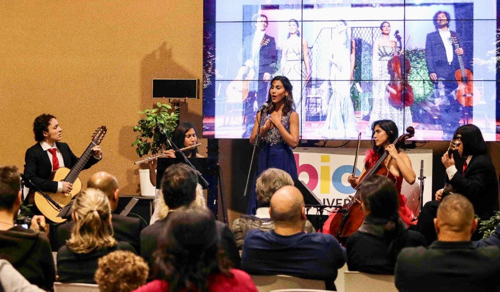 La soprano dominicana Nathalie Peña-Comas y el Ensamble Spirituosi, compuesto por Damien Lancelle, Evelyn Peña-Comas, Nicole Peña-Comas y Gonzalo Manrique en el concierto lírico organizado por el pabellón de República Dominicana y la Oficina de Promoción Turística en el Teatro della Terra de Expo Milano 2015, el 18 de octubre de 2015. [Foto: Alexander Pérez Ponce]