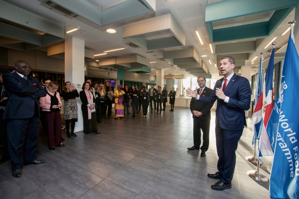 Mario Arvelo delivers welcoming remarks at a diplomatic reception he hosted at the World Food Program (WFP) headquarters on the occasion of the National Day of the Dominican Republic on 27 February 2019, coinciding with the closing of a session of the Executive Board of the institution. He is accompanied by WFP representative in the Dominican Republic William Vigil.