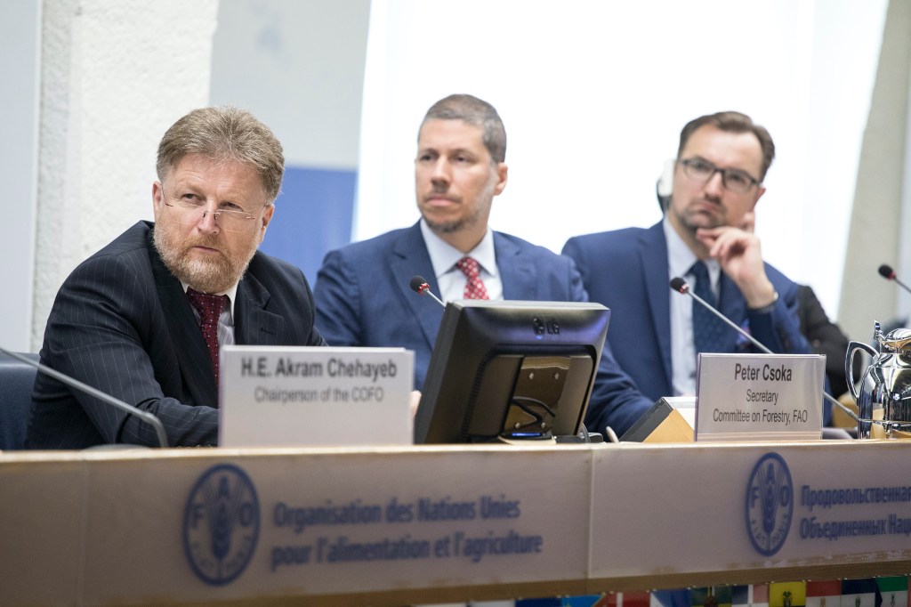 Mario Arvelo pronuncia el discurso central en la sesión de apertura del 24º período de sesiones del Comité Forestal de Naciones Unidas, el 6 de julio de 2018. En su alocución, manifestó que cuando se menciona a los bosques en el contexto de la seguridad alimentaria y nutricional es casi siempre en sentido negativo, donde los bosques son vistos como un territorio condenado a ser explotado para facilitar la expansión de los sembradíos; nosotros podemos hacer una lectura positiva: la foresta y los árboles hacen contribuciones directas y abundantes a la oferta alimentaria mientras crean empleo rural, generan ingresos, proveen hábitat para el ochenta por ciento de las especies animales, protegen la biodiversidad de la que todos dependemos, resguardan a los suelos de la erosión, suplen madera para bioenergía y construcción, sostienen servicios de ecosistema tanto a nivel local como global —incluyendo el control de plagas y la polinización—, acumulan carbono, minimizan inundaciones y deslizamientos de tierra, recogen gases de efecto invernadero de la atmósfera, apoyan la resiliencia de los campesinos, y reciclan y purifican el agua que bebemos y el aire que respiramos. [Foto ©FAO/Giuseppe Carotenuto]