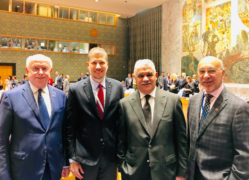 El Embajador ante el Consejo de Seguridad de la Organización de Naciones Unidas (ONU) José Singer, Mario Arvelo, el Ministro de Relaciones Exteriores Miguel Vargas, y el Embajador en Bélgica y ante la Unión Europea Aníbal de Castro en la sala del Consejo. Los cuatro diplomáticos dominicanos asistieron a una sesión en septiembre de 2019; el país fue electo para formar parte del órgano ejecutivo del sistema internacional durante el bienio 2019-2020.