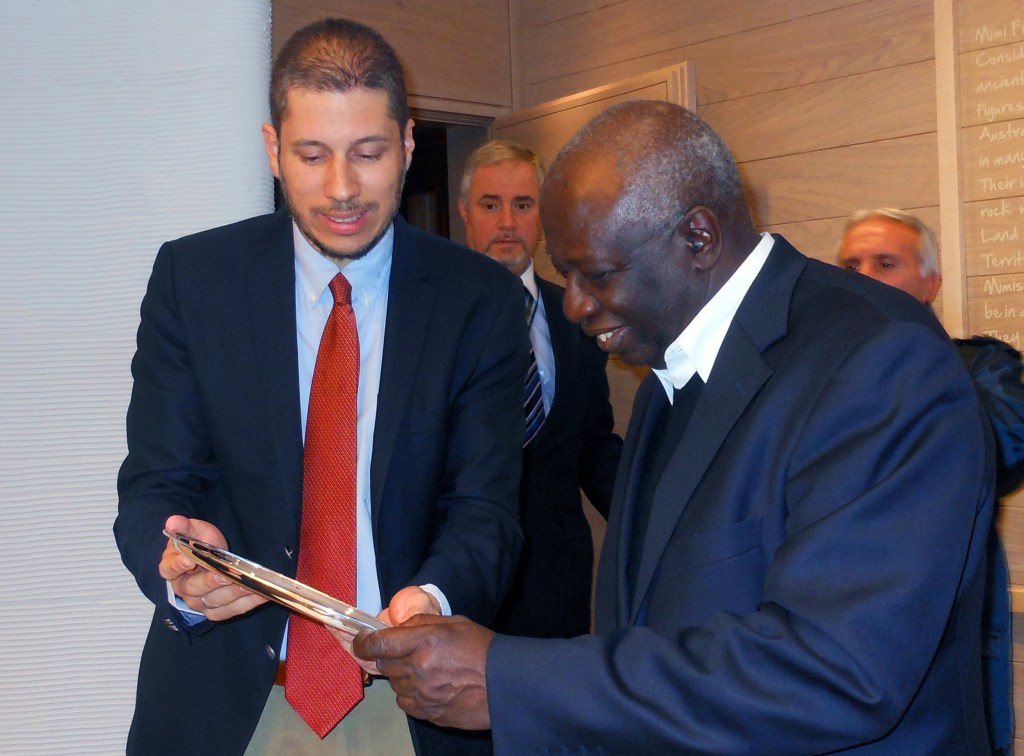 Mario Arvelo, en representación del Grupo de Países Latinoamericanos y Caribeños, entrega una placa conmemorativa a Jacques Diouf con motivo del término de su mandato como director general de la Organización de Naciones Unidas para la Alimentación y la Agricultura (FAO), que lideró entre 1993 y 2011.