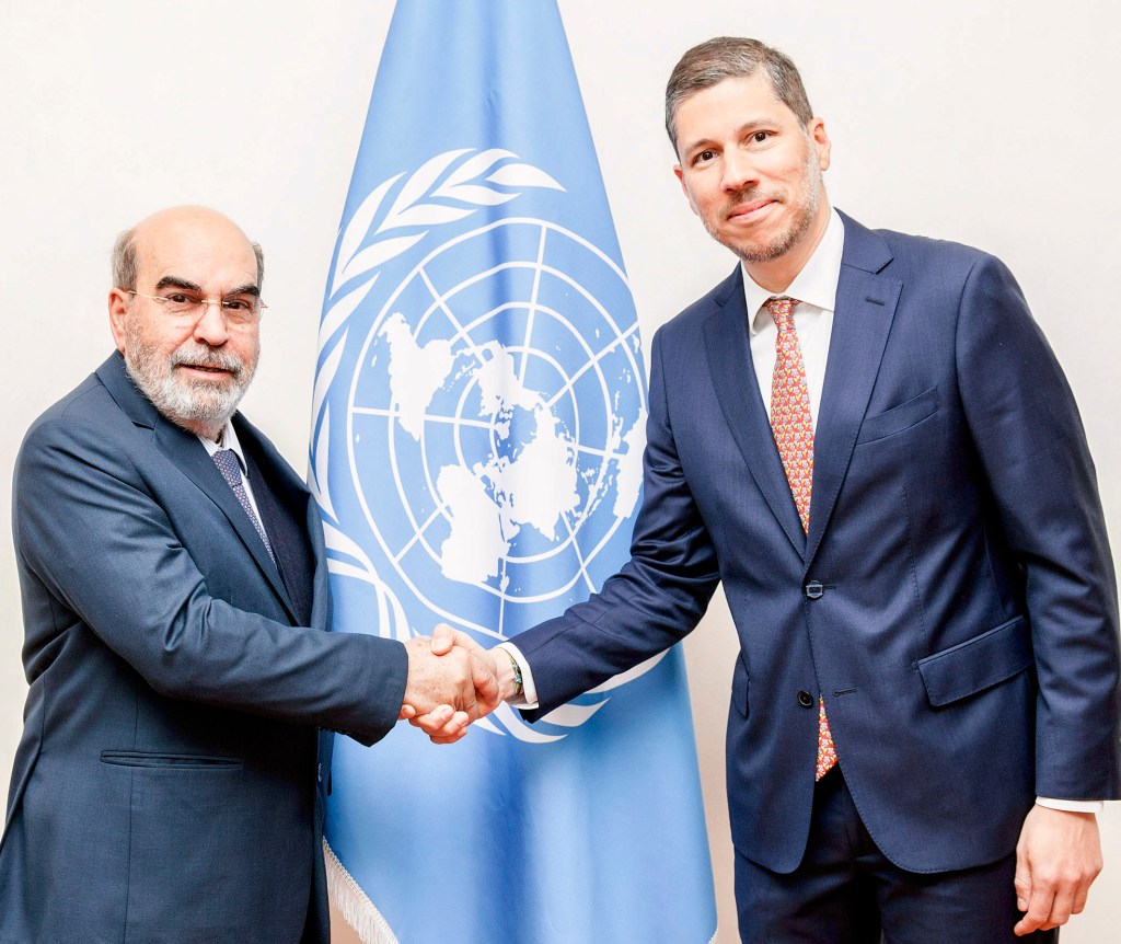 El director general de la Organización de Naciones Unidas para la Alimentación y la Agricultura (FAO) José Graziano da Silva felicita a Mario Arvelo por su elección como presidente del Comité de Seguridad Alimentaria Mundial. Graziano lideró la FAO de 2012 a 2019. [Foto ©FAO/Giulio Napolitano]
