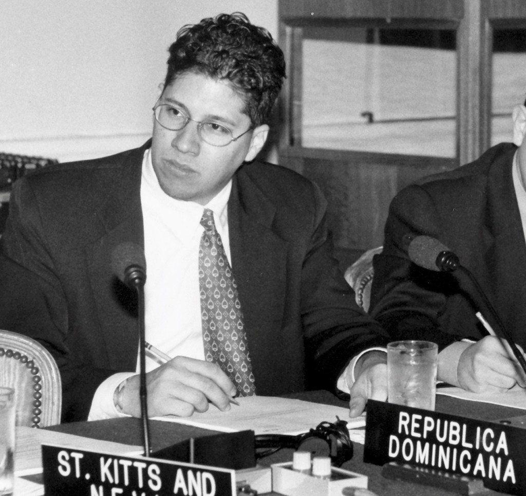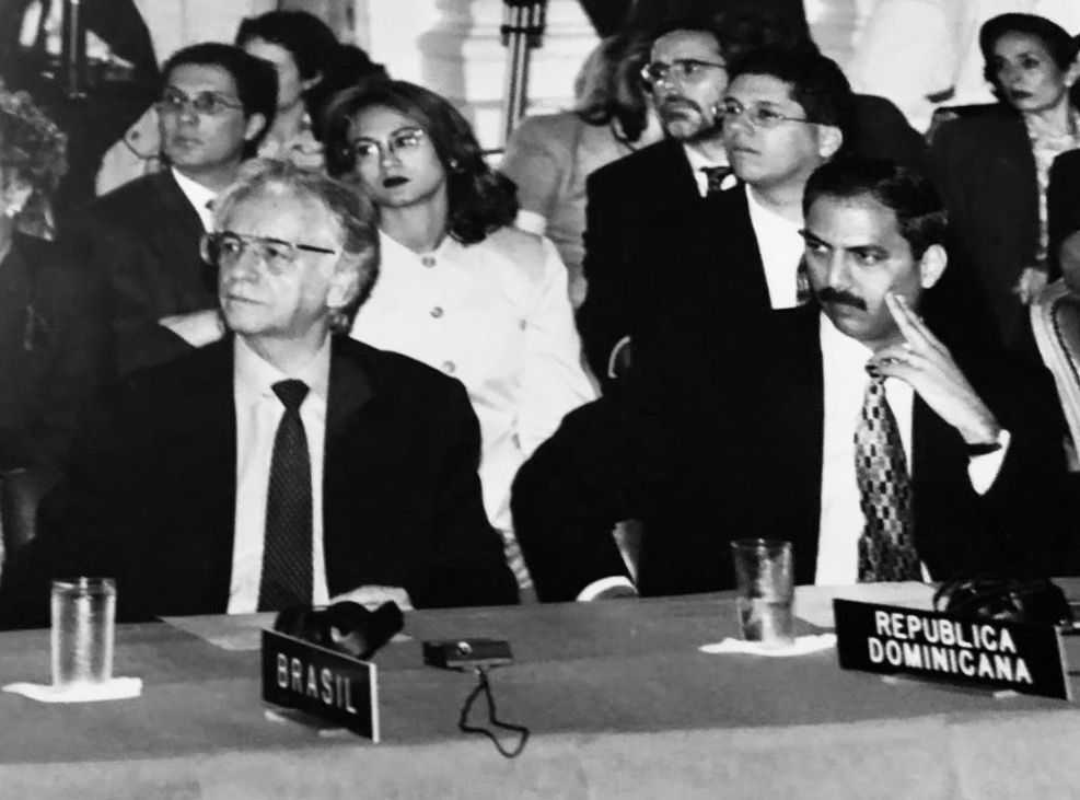 Mario Arvelo —entonces primer secretario y representante alterno de República Dominicana ante la Organización de Estados Americanos (OEA)— asiste a una sesión del Consejo Permanente de la OEA junto al embajador dominicano Flavio Darío Espinal (a cuyo lado figura el expresidente brasileño Itamar Franco).