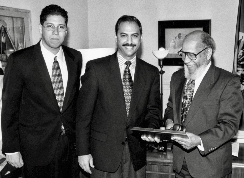Mario Arvelo acompaña al embajador de República Dominicana ante la Organización de Estados Americanos (OEA) Flavio Darío Espinal en la ceremonia de entrega de un mazo conmemorativo al embajador de Santa Lucía Joseph Edmunds, en ocasión del traspaso de mando de la presidencia del Consejo Permanente de la OEA, en 1997.