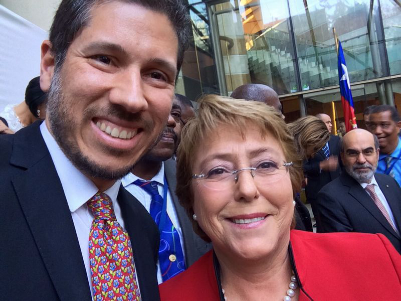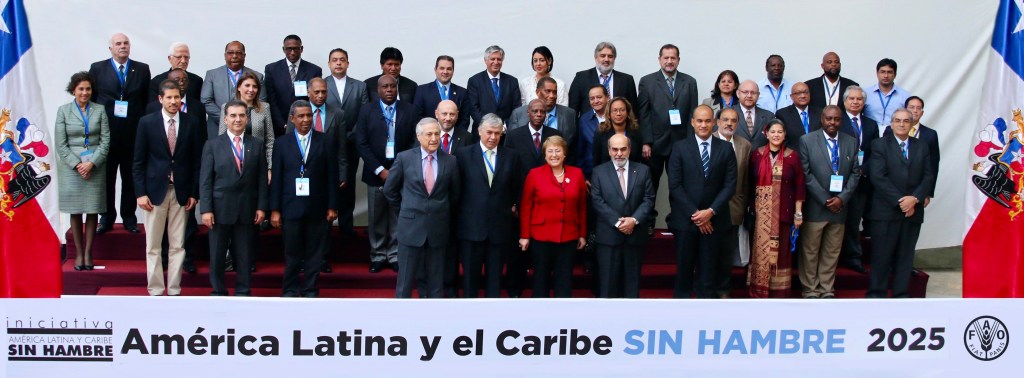 Mario Arvelo junto a la presidenta chilena Michelle Bachelet antes de la ‘foto de familia’ de los ministros de Agricultura y de Desarrollo Rural asistentes a la 33ª Conferencia Regional de la Organización de Naciones Unidas para la Alimentación y la Agricultura (FAO) para América Latina y el Caribe, celebrada en Santiago de Chile en mayo de 2014. A la derecha aparece el director general de la FAO José Graziano da Silva.