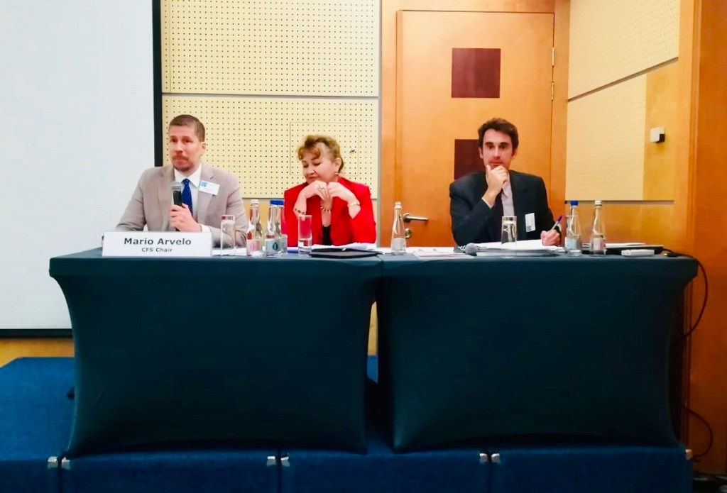 Mario Arvelo participa en una consulta internacional de expertos sobre «Nutrición y sistemas alimentarios en Europa», en el marco de las negociaciones globales conducidas por el Comité de Seguridad Alimentaria Mundial (CSA) con miras a la aprobación de Directrices voluntarias sobre ambos temas (logro que se obtuvo durante la 47ª sesión del CSA en febrero de 2021). Junto a Arvelo aparecen en la imagen la presidenta del Grupo de trabajo de composición abierta sobre sistemas alimentarios y nutrición del CSA Liliane Ortega y el coordinador de Nutrición y Sistemas Alimentarios del secretariado del comité Emilio Colonnelli. La actividad tuvo lugar en Budapest, Hungría los días 16 y 17 de septiembre de 2019.