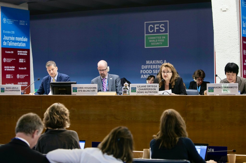 Mario Arvelo preside el panel internacional de expertos «Nutrición y sistemas alimentarios», el cual tuvo como moderador al coordinador general de los Diálogos sobre sistemas alimentarios del Foro Económico Mundial David Nabarro. El panel, que se celebró en la sede de la Organización de Naciones Unidas para la Alimentación y la Agricultura (FAO) en octubre de 2019 incluyó, además de Arvelo y Nabarro, a la directora general Adjunta de la Organización Mundial de la Salud (OMS) Naoko Yamamoto; la oficial superior de nutrición y sistemas alimentarios y asesora especial del Presidente Ejecutivo de la Nueva Alianza para el Desarrollo de África Bibi Giyose; la presidenta del Grupo de trabajo de composición abierta sobre sistemas alimentarios y nutrición del Comité de Seguridad Alimentaria Mundial (CSA) Liliane Ortega; la profesora asociada del Instituto de Nutrición de la Universidad de Mahidol, Tailandia Emorn Udomkesmalee; y la directora regional para América Latina de Agricultura y Alimentación del Banco Mundial Preeti Ahuja. [Foto ©FAO/Giulio Napolitano]