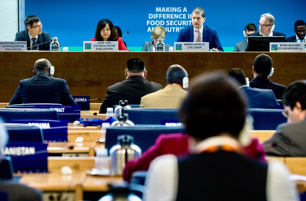 Un capítulo que, debido a las resistencias encontradas (tratándose de cuestiones de particular importancia sobre el carácter inclusivo del comité, su transparencia operacional y la legitimidad democrática que sus miembros deben exigirle) fue postergado para que los negociadores pudiesen contar con un plazo más amplio para alcanzar la convergencia de opiniones. Sobre esta difícil cuestión, que estuvo a punto de llevar las negociaciones al fracaso, Arvelo también logró —en octubre de 2019— el acuerdo unánime de la comunidad internacional alrededor de su propuesta de reforma sobre la inclusión, la transparencia y la legitimidad democrática del Comité de Seguridad Alimentaria Mundial. [Foto ©FAO/Alessandra Benedetti]