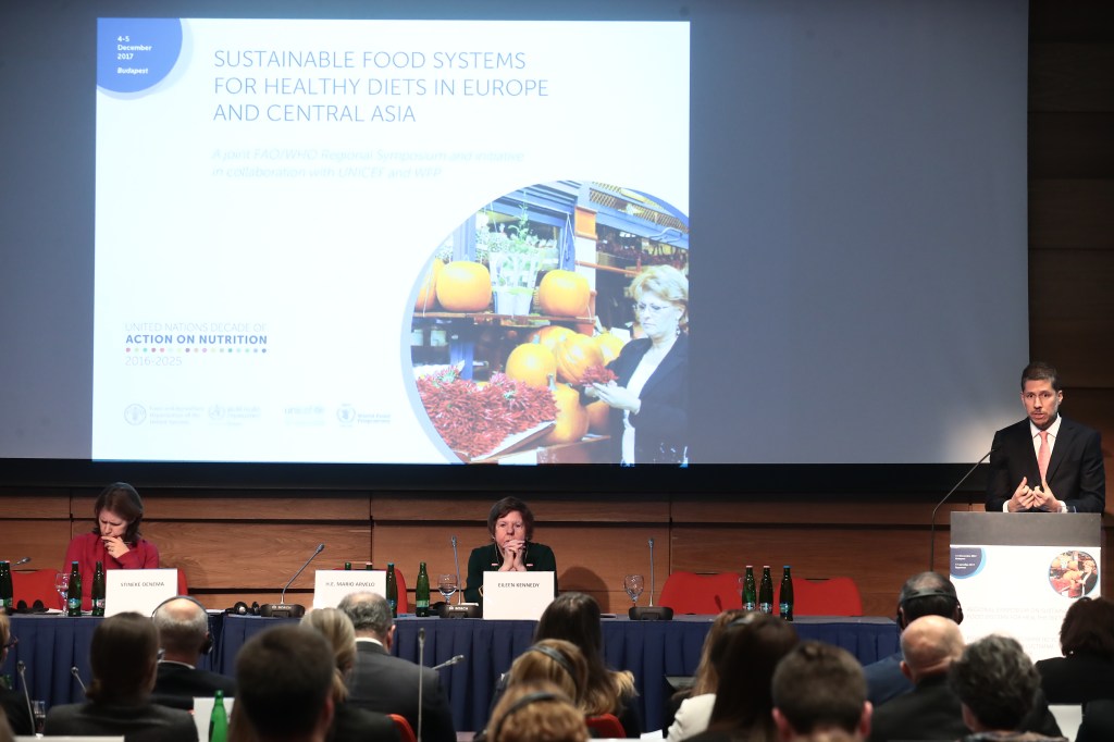 Mario Arvelo pronuncia un discurso en el simposio internacional «Sistemas alimentarios sostenibles para dietas saludables en Europa y Asia Central», coordinado por la Organización de Naciones Unidas para la Alimentación y la Agricultura (FAO). Arvelo subrayó la importancia de convertir las recomendaciones de políticas sobre el tema formuladas por el Grupo de Alto Nivel de Expertos en Seguridad Alimentaria y Nutricional (GANESAN) en directrices voluntarias, pues un proceso inclusivo, donde los gobiernos se sienten a debatir y negociar con representantes de la sociedad civil, del sector privado, del mundo académico, de centros de investigación agrícola, de entidades filantrópicas y de otras partes interesadas, tendrá la legitimidad para proponer políticas claras y coherentes que, una vez incorporadas a las legislaciones nacionales y a los programas regionales y globales impulsados por las agencias de Naciones Unidas para su implementación sobre el terreno, tendrán un impacto positivo en la lucha contra el hambre y todas las formas de malnutrición. Este llamado se hizo realidad con la adopción, casi cuatro años después de esta intervención, de las Directrices voluntarias del Comité de Seguridad Alimentaria Mundial sobre los Sistemas Alimentarios y la Nutrición.